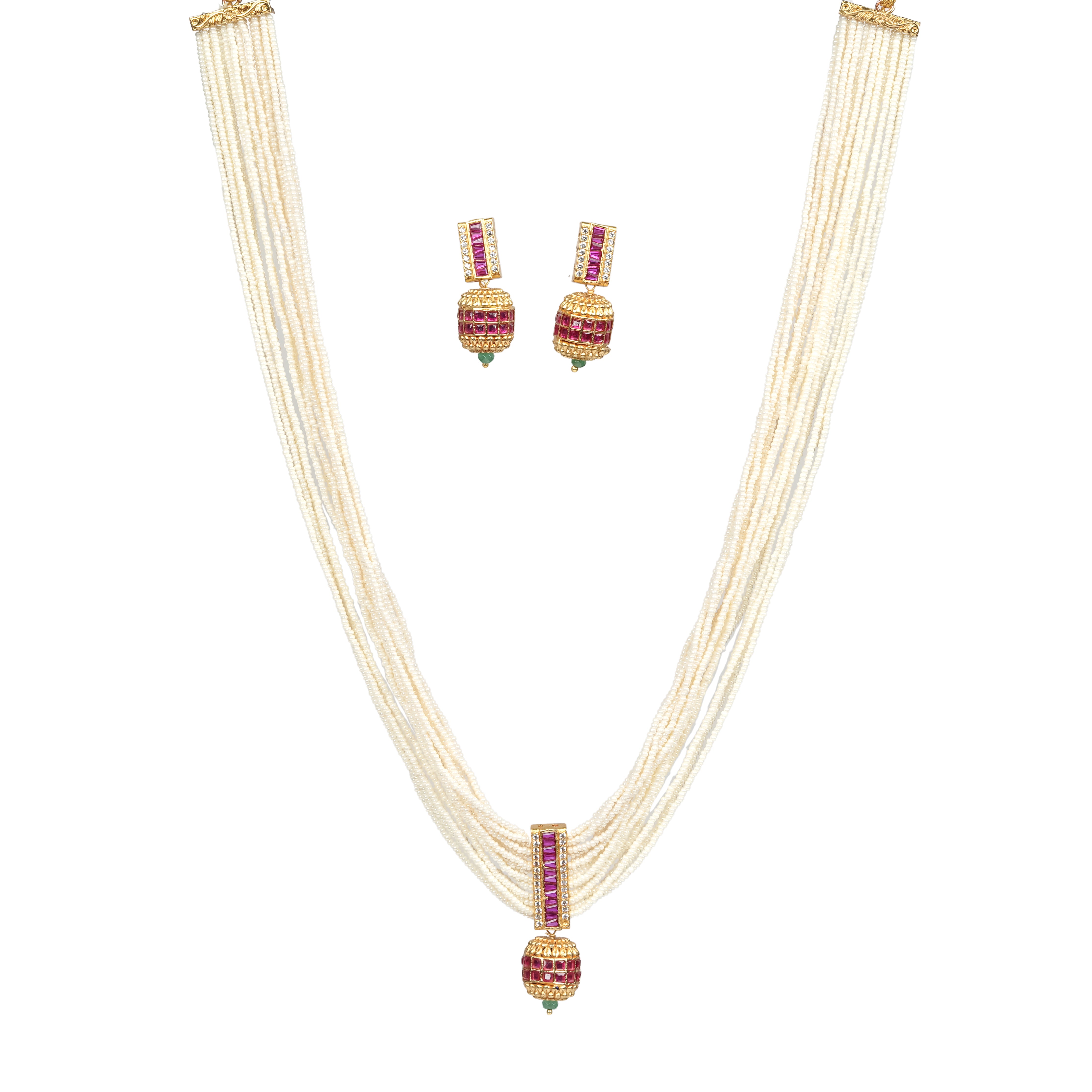 Multi-Strand Pearl & Ruby Barrel Pendant Necklace Set