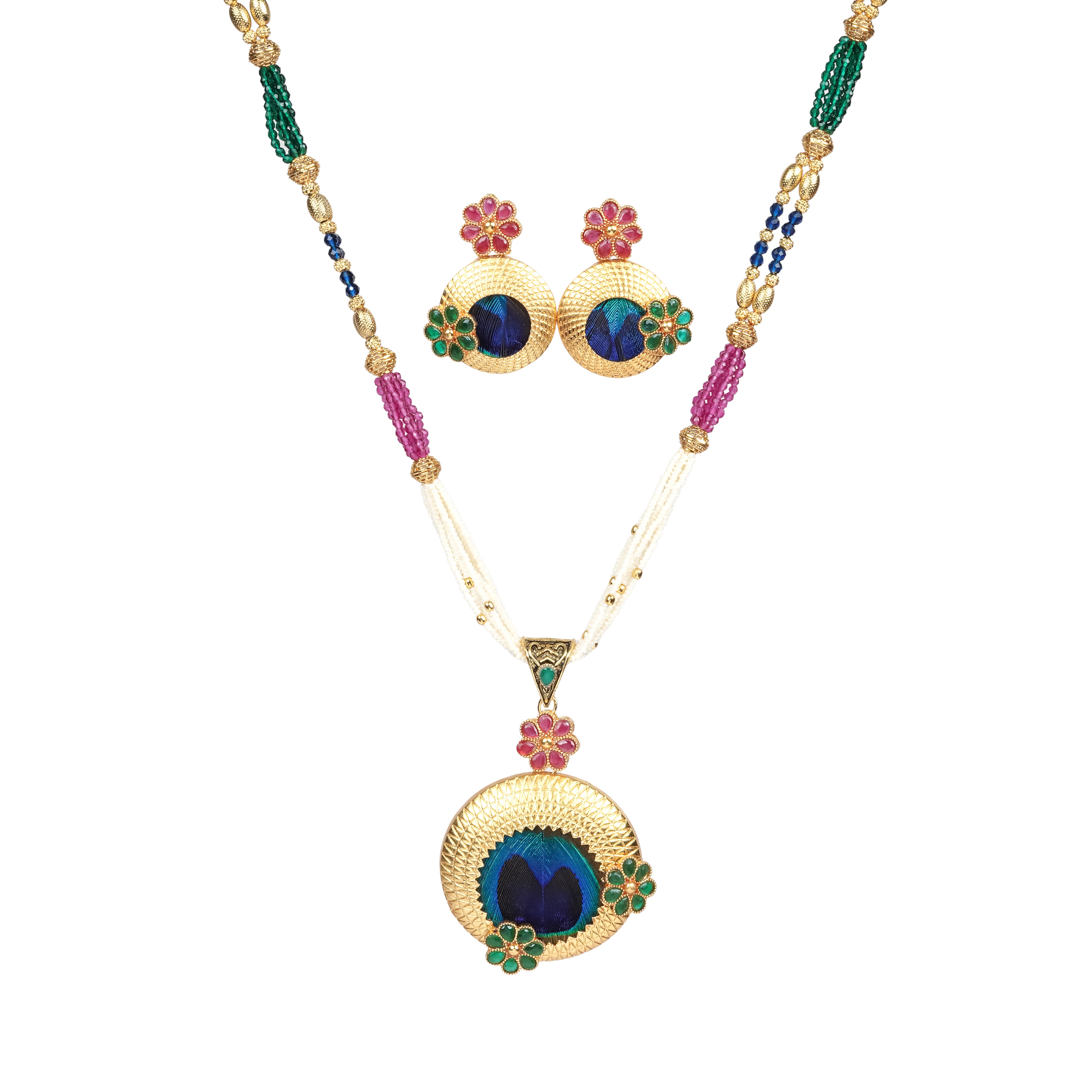 A radiant celebration of color and craftsmanship, this jewelry set blends the natural elegance of peacock feathers with vibrant floral artistry. The golden textured pendants shimmer with deep blue and emerald hues, while delicate pink and green enamel flowers add a lively charm. Paired with a beaded necklace of pearls, ruby tones, sapphire blues, and emerald greens, this piece feels both festive and timeless—perfect for those who adore jewelry that tells a story of nature, beauty, and tradition.